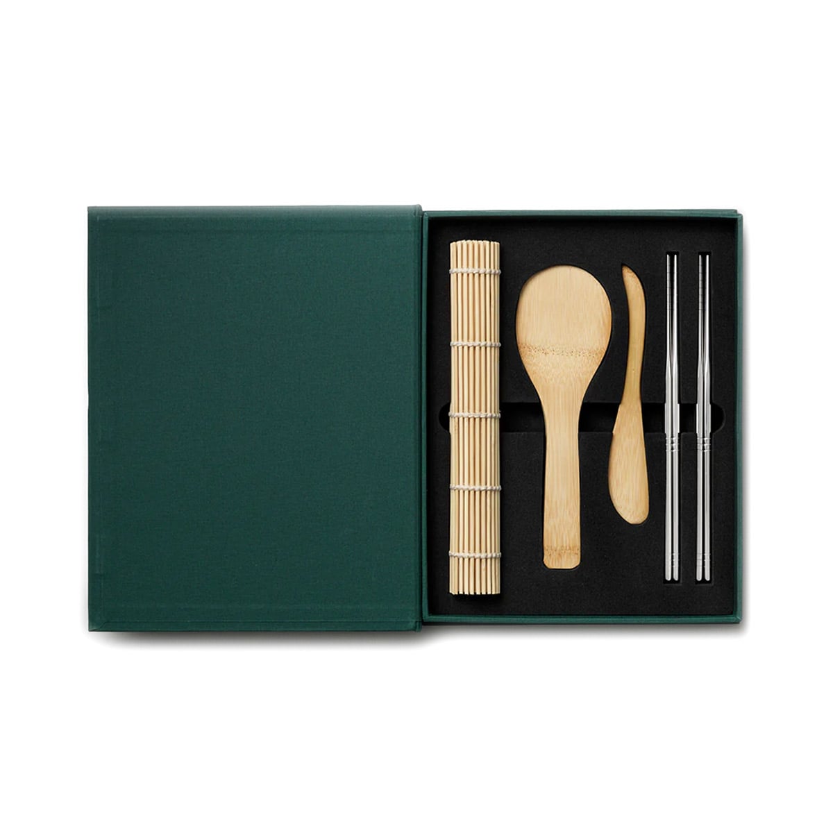დაეუფლეთ იაპონური სამზარეულოს ხელოვნებას სუშის მოსამზადებელი ელეგანტური ნაკრებით, რომელიც დახვეწილი წიგნის ფორმის ყუთშია მოთავსებული. ნაკრებში შედის ყველა საჭირო ინივთი სახლის პირობებში პროფესიონალური სუშის მოსამზადებლად.