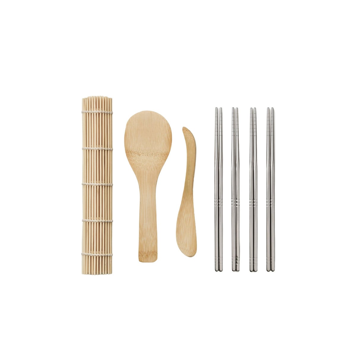დამზადებულია მაღალი ხარისხის, ეკოლოგიურად სუფთა ბამბუკის ხის და უჟანგავი მეტალისგან. ნაკრებში შედის 1 ბრინჯის კოვზი, 1 დანა, 1 გადასახვევი ხალიჩა და 4 წყვილი ჩხირი.