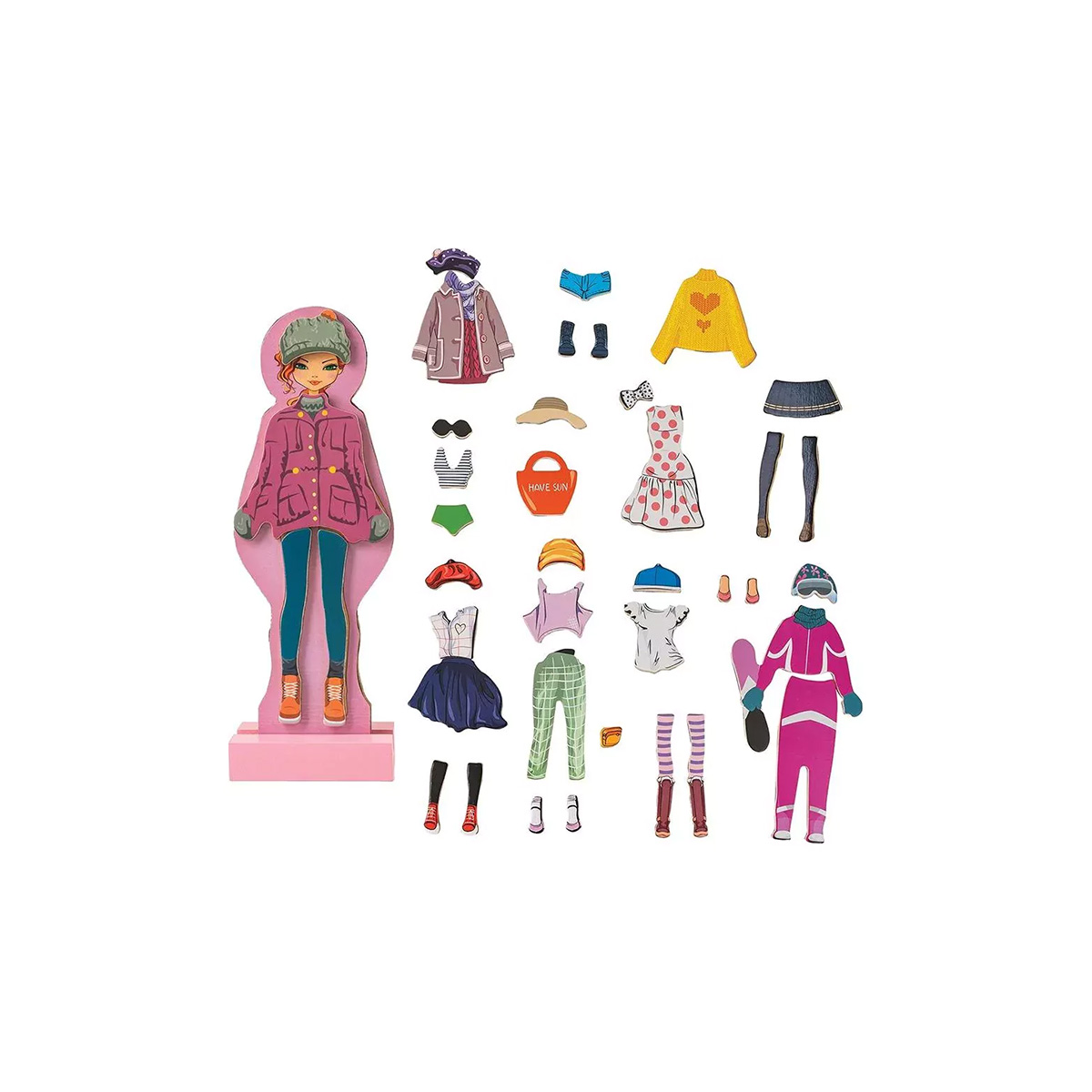 ვის არ უყვარს თოჯინების ლამაზად გამოწყობა ან მაგნიტებით თამაში? ეს ულამაზესი გოგონა გელოდებათ, რომ ტანსაცმელი მოარგოთ. ნაკრებში შეხვდებით მაგნიტურ გოგონას თავისივე სადგამით და 40 მაგნიტს სხვადასხვა ტანსაცმლის აქსესუარით, რათა ის სხვადასხვანაირად გამოაწყოთ.